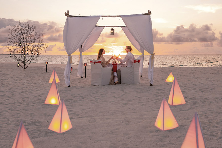 The resort’s astoundingly beautiful location allows for adventurous couples to create incredible shared moments, from sinking beneath the surface to say hello to the atoll’s underwater denizens to speeding over the surface on a jet ski ride for two. A whole world of unique experiences are found on this quaint atoll, where you can enjoy beach BBQs and blissful private pergola dinners for you and your paramour under the dazzling night sky.